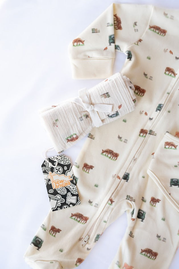 Featuring our much loved farm print, this newborn baby gift set includes: