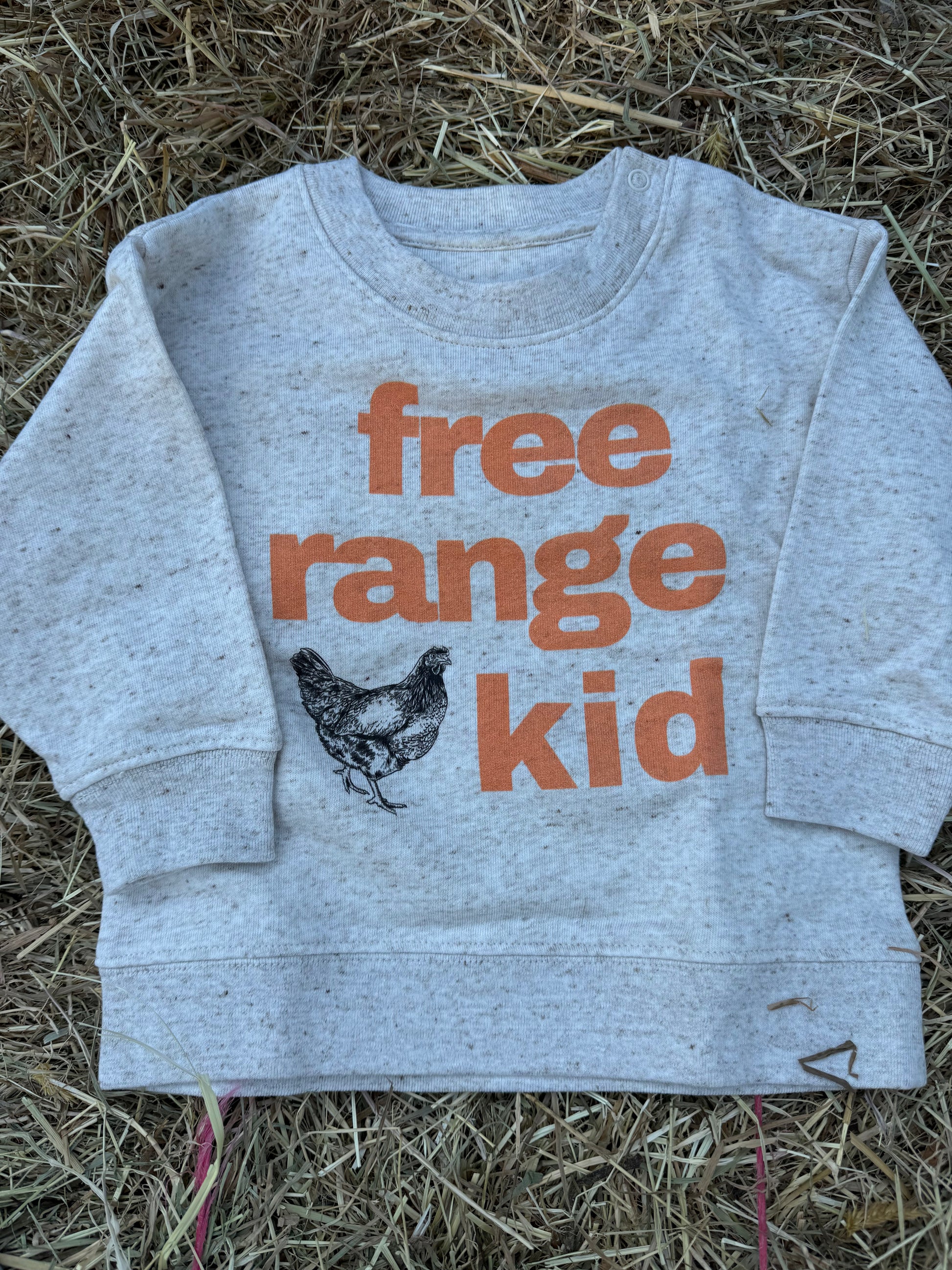 With the iconic Free Range Kid chest print in our signature orange, and the accompanying chicken graphic, this is a must have jumper for all country loving outdoor kids.