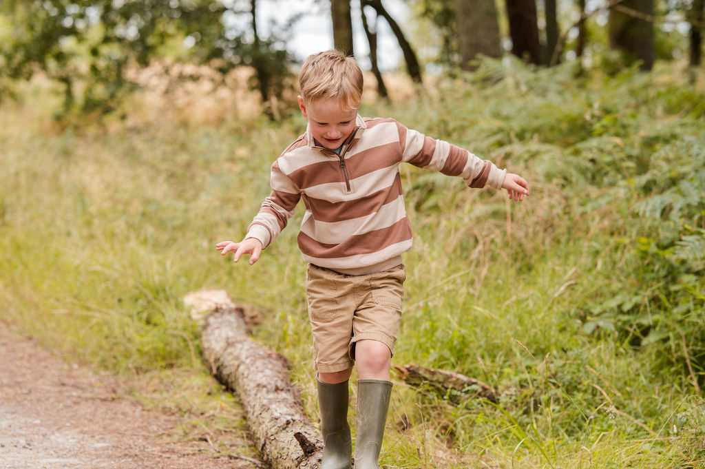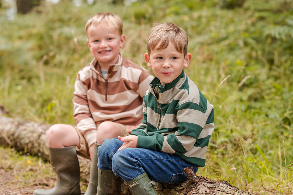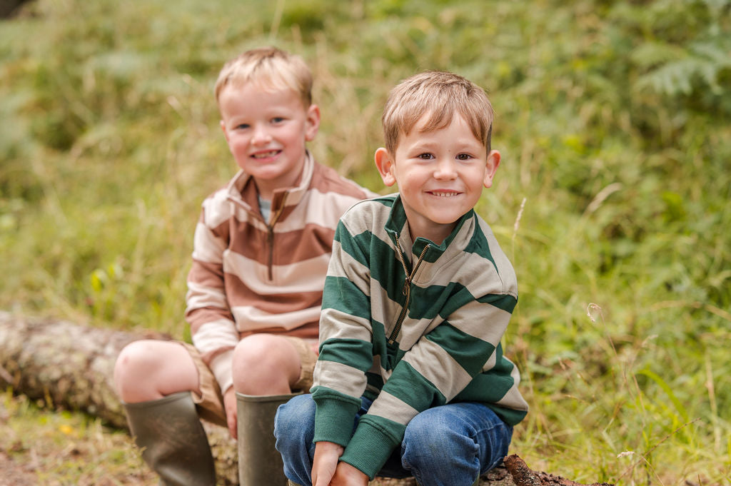 Our Heritage neutral Stripe Quarter Zip is made from 100% cotton brushback— soft, breathable, and woven entirely from natural fibres for lasting comfort. In a beige and cream neutral stripe. The super-soft finish feels lived-in from the very first wear, while the rugby-inspired stripes bring timeless countryside style to every adventure.